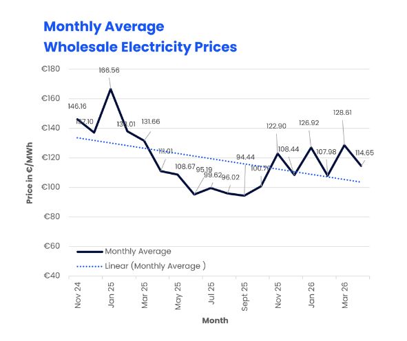 - As of April 13th, Irish wholesale electricity prices are trading at a monthly average of €114.65 per MWh.